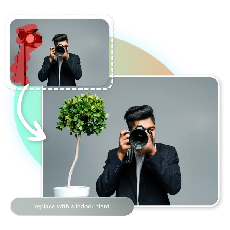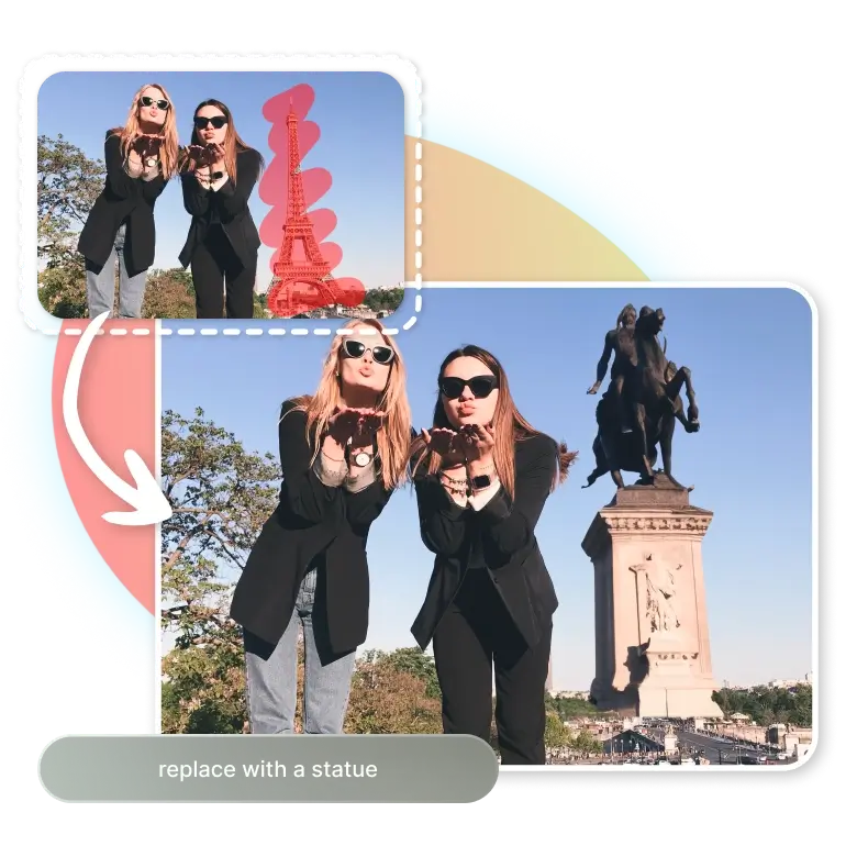 AI Replace, fotoğraflarınızdaki öğeleri istediğiniz nesnelerle sorunsuz bir şekilde değiştirir. Değiştirmek istediğiniz nesneyi işaretlemeniz ve komut kutusuna yeni nesnenin bir açıklamasını girmeniz yeterlidir; araç, fotoğraftaki nesneyi gerçekçi bir şekilde değiştirecektir.