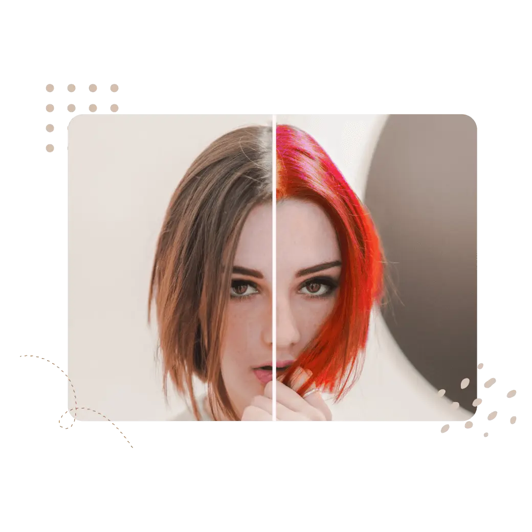 Son boya işinden bu yana uzun zaman mı geçti? Yoksa gerçekten boyanmadan bir renk denemek mi istiyorsunuz? Yoksa sadece biraz eğlence mi arıyorsunuz? Sanal Sahneleme'nin saç rengi değiştiricisi - Renk Sıçrama aracıyla hepsini ve daha fazlasını zahmetsizce yapın. Sadece birkaç saniyede siyahtan sarıya veya kızıldan kahverengiye geçin. Sanal Sahneleme'nin Renk Sıçrama aracındaki 'Ayarlama' özelliğiyle, yeni bir saç rengi ve görünümü elde etmek için Işık, Gama, Renk ve Beyaz Dengesi etrafında çalışın. O kadar doğal ve etkileyici bir sonuç elde edin ki, rengin tam size göre olduğu anlaşılsın!