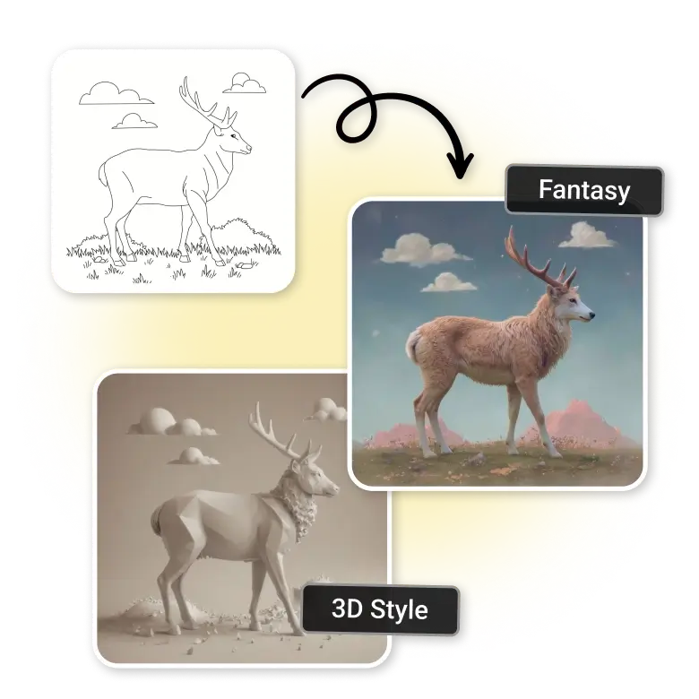 Bu, taslağı dijital sanata dönüştürür AI, yalnızca kaba çizimlerin ötesinde birden fazla türde özel girdiyi kabul eder. Belirli özelliklere sahip kontrollü bir nesil için metin istemlerini girin. Örneğin, taslak sahneler için ortamı veya renk şemasını tanımlayabilirsiniz. Veya gerçekçi, karikatürize ve diğerleri gibi farklı sanatsal görsel tercihleri uyarlamak için görüntüden görüntü üretebilirsiniz .