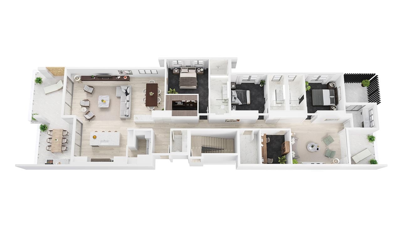 Dahili Render, düzeni, potansiyel mobilyaları, ferahlığı ve işlevselliği göstererek kat planınızı canlandırır ve bunları siyah beyaz bir planın çok ötesine taşır. Müşterilerinizi doğrudan sunulan eve ve yaşam tarzına getirin.