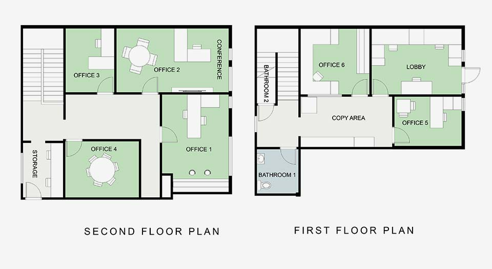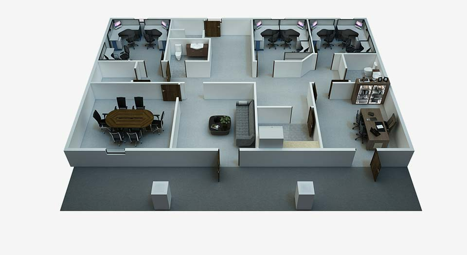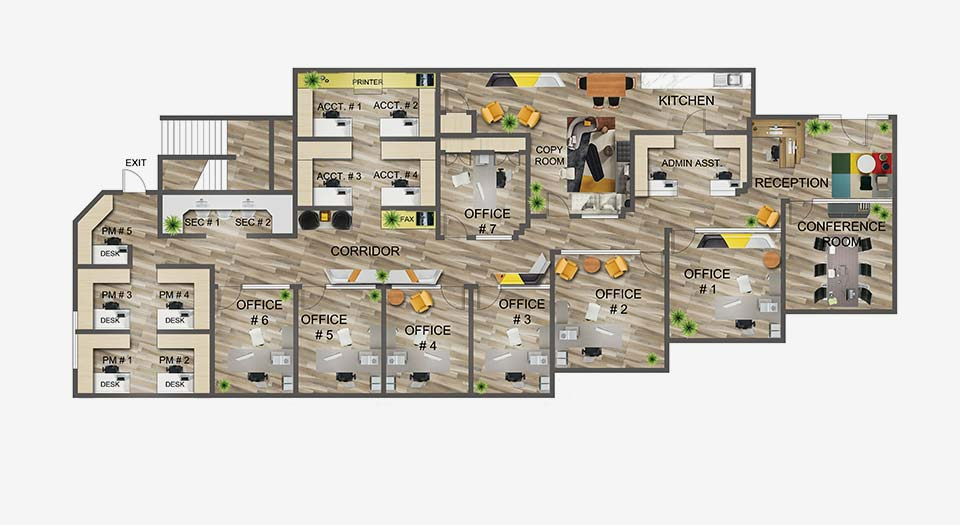 Alıcıların 2D tam renkli bir kat planıyla bir ofis alanını veya gelecekteki yenilemelerin potansiyelini nasıl düzenleyebileceklerini görmelerine yardımcı olun. Bu ayrıca, aksi takdirde basit bir düzene görsel ilgi unsuru daha ekler.